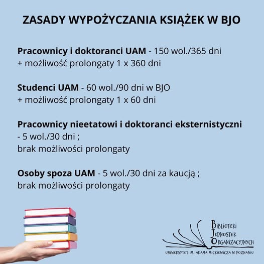 Nowy system biblioteczny Alma oznacza nowe zasady udostępniania zbiorów. Więcej informacji znajduje się w zakładce Regulaminy.