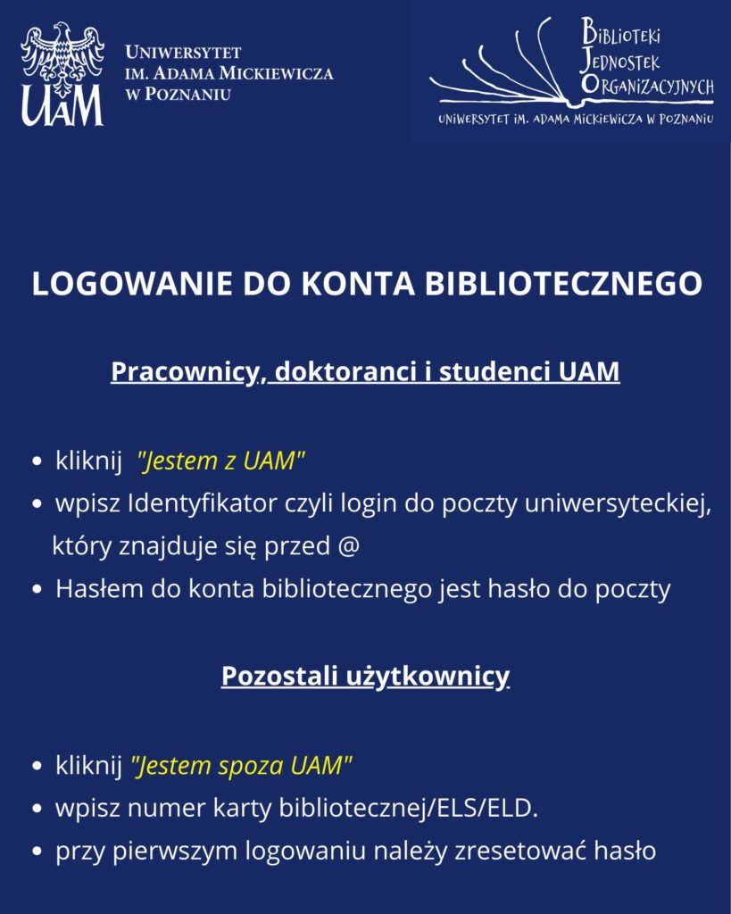 - Konto można założyć stacjonarnie w swojej macierzystej bibliotece lub w Bibliotece Uniwersyteckiej.