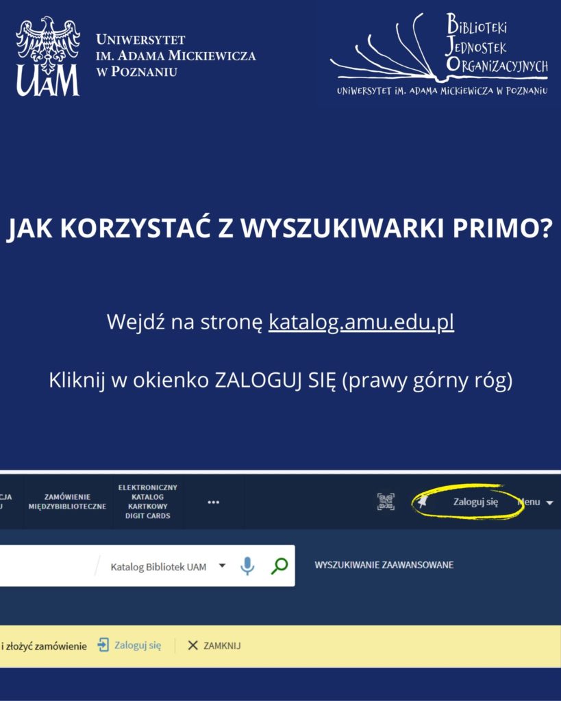 Należy wejść na stronę katalog.amu.edu.pl i w prawym górnym rogu kliknąć Zaloguj się